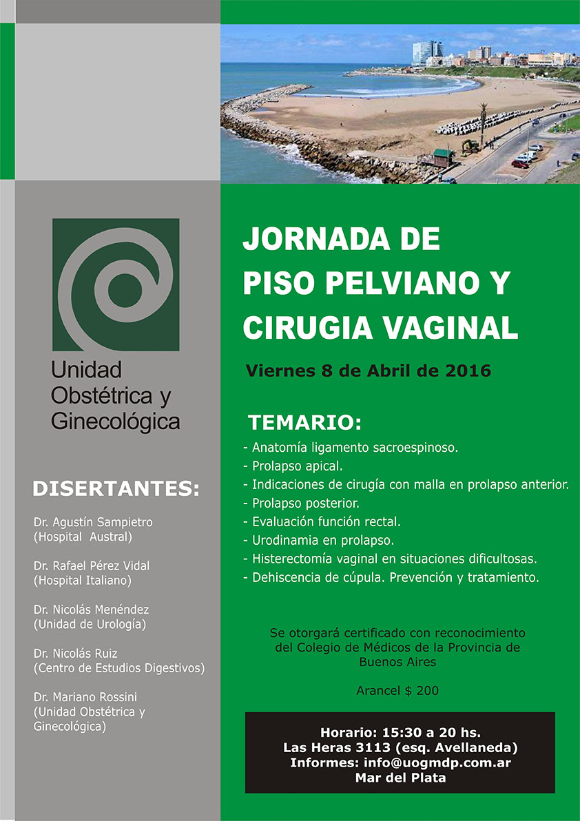 El día 8 de Abril de 2016, se realizará una jornada de piso pelviano y cirugía vaginal en la sede de la Unidad Obstétrica y Ginecológica de Mar del Plata cita en la calle Las Heras 3113 (Esq. Avellaneda).